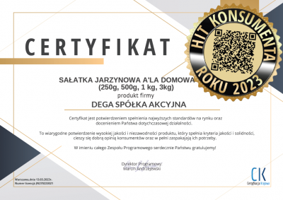 Miło nam poinformować, że nasza TOP sałatka otrzymała prestiżowy tytuł HIT Konsumenta 2023 w konkursie organizowanym przez CK Certyfikacja Krajowa.