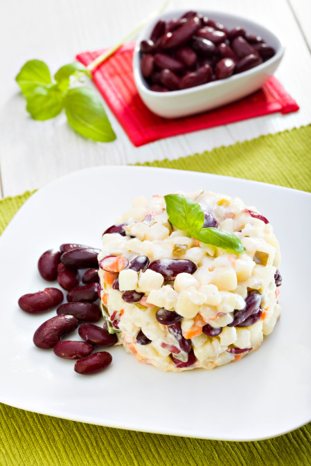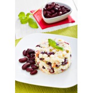 Znakomita sałatka z warzywami na bazie ziemniaków, czerwonej fasoli, słodkiej marchewki, ogórka i cebulki. Doprawiona aromatyczną nutą przypraw : )