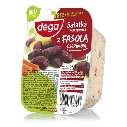 Sałatka z warzywami 71 %. Główne składniki: ziemniaki, fasola 18 %, marchew, olej rzepakowy, woda, ogórek, cukier, przyprawy (zawierają gorczycę), sól, ocet spirytusowy, skrobia modyfikowana, śmietana w proszku (z mleka); żółtko jaja w proszku, regulatory kwasowości: kwas mlekowy, kwas cytrynowy; substancje konserwujące: sorbinian potasu, benzoesan sodu; ekstrakt kopru, aromaty.